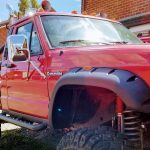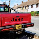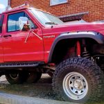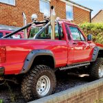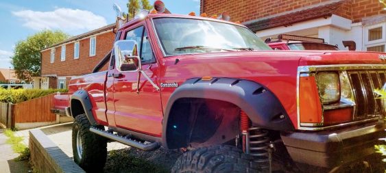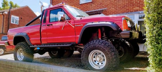 Incredible American legend. Jeep Comanche. A truck on the big 35″ wheels with chrome exhaust pipes aimed at the sky. The only one of this style in England and Europe. It arouses great admiration even in the USA where it comes from.